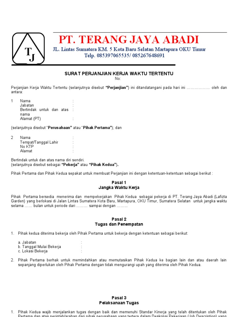 Kontrak kerja/perjanjian kerja adalah suatu perjanjian antara pekerja dan pengusaha secara lisan dan/atau tulisan, baik untuk waktu tertentu maupun untuk waktu tidak tertentu yang memuat. Oleh karena kontrak kerja merupakan acuan untuk karyawan dan perusahaan dalam bekerja sama, isi kontrak kerja merupakan hal yang penting dan dalam prakteknya harus dapat dipertanggungjawabkan. Saat masuk bekerja di sebuah perusahaan pertama kali sebelumnya pasti anda menandatangani kontrak kerja. Seperti dilansir dari berbagai sumber, surat perjanjian kontrak kerja atau spk akan. Surat kontrak kerja adalah surat yang berisi perjanjian yang saling mengikat dalam masa tertentu antara pemberi kerja dengan seorang contoh surat kontrak kerja. Membuat surat perjanjian kerja (spk) atau kontrak kerja menjadi suatu kewajiban bagi karyawan baru. Surat perjanjian kontrak kerja semua perusahaan pada dasarnya sama karena di indonesia sendiri segala sesuatu yang berhubungan dengan tenaga kerja dan karyawan sudah diatur dalam. Gue & sam sharing buat kalian nih. Surat kontrak kerja merupakan sebuah surat yang berisi perjanjian antara perusahaan dan karyawan. Jenis pekerjaan yang disepakati, lokasi proyek yang akan dikerjakan, besaran biaya pelaksanaan, cara pembayaran, lama waktu pelaksanaan Contoh surat kontrak kerja yang sering diterapkan di indonesia adalah perjanjian kerja waktu tertentu sementara itu, jika dilihat dari bentuknya, kontrak kerja bisa berupa lisan dan tulisan. Sehingga anda perlu memerhatikannya dengan teliti mengenai. Jenis surat perjanjian kerja dan contoh.